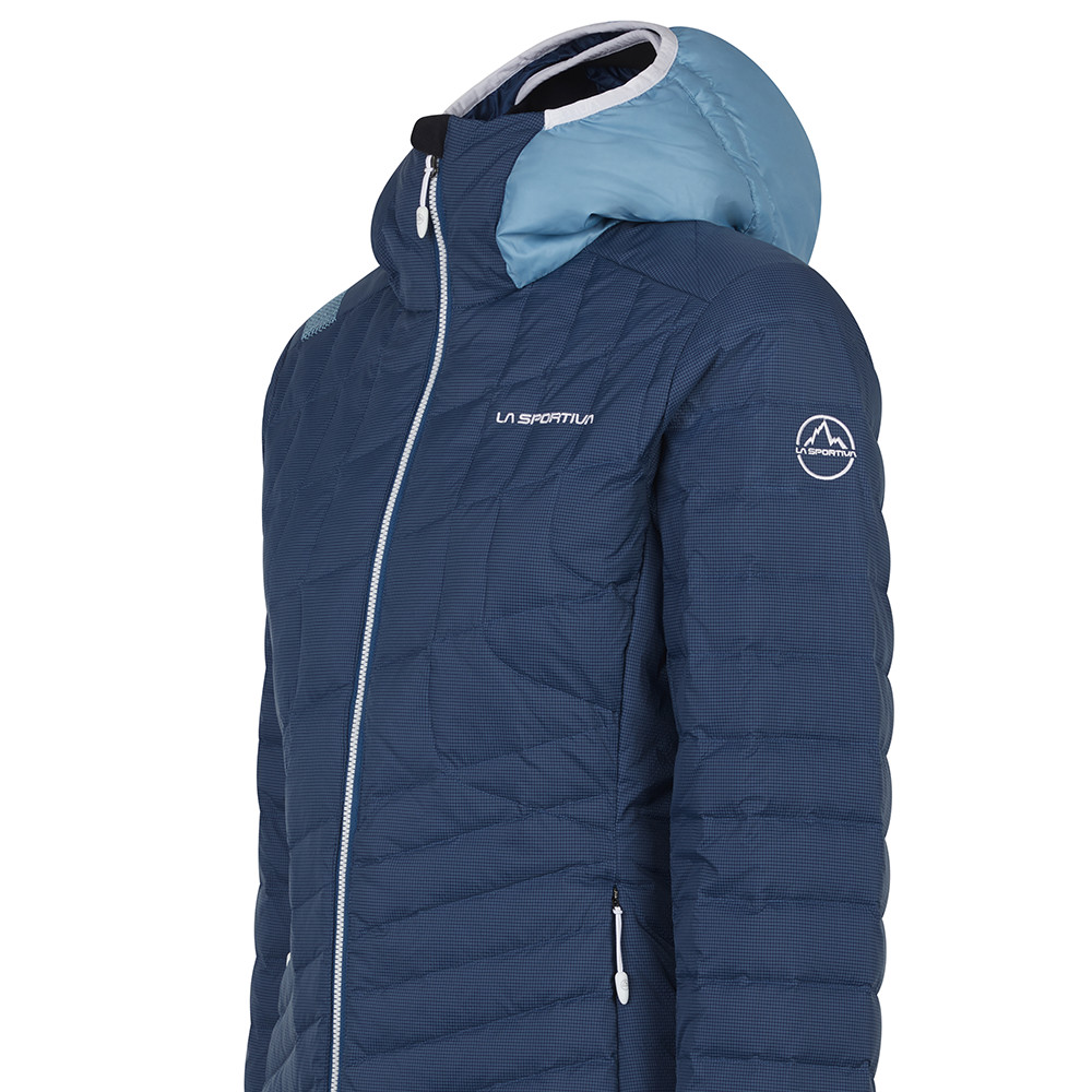 Dámska páperová bunda s kapucňou od firmy La Sportiva vhodná pre aktivity v horách ako je horolezectvo alebo skialpinizmus. Plnenie husím perím skvele zahreje aj vysoko v horách.