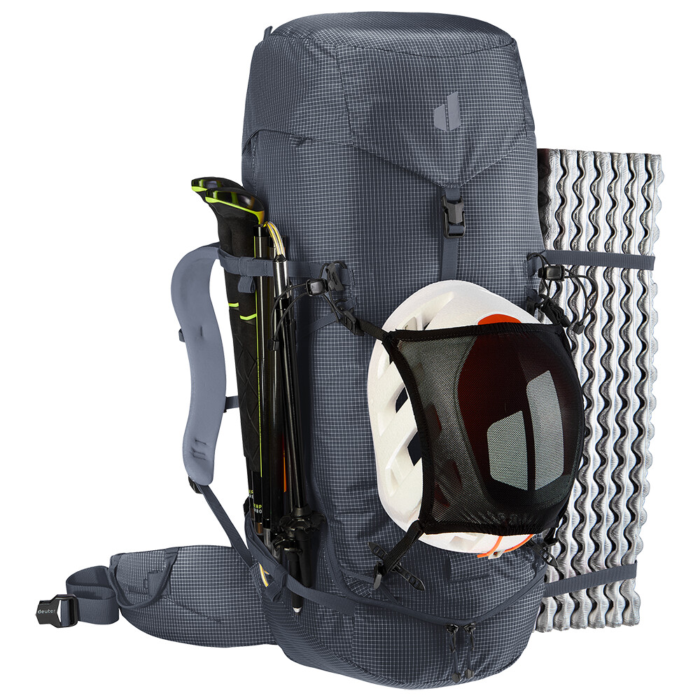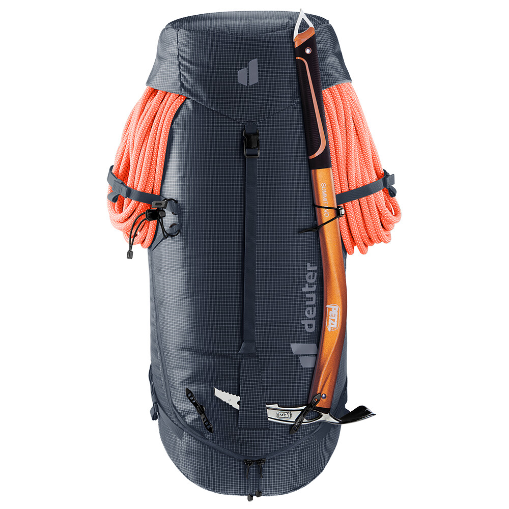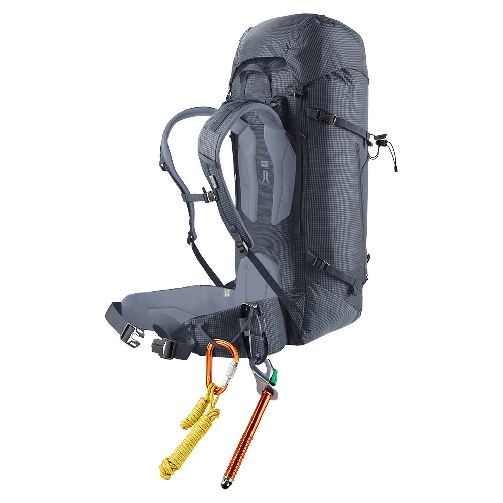 Časom overený batoh pre horolezcov a alpinistov Guide od spoločnosti deuter je ideálny batoh na prenášanie všetkého lezeckého vybavenia, cepínov, lana, prilby a dokonca ajlyží. Je strihaný tak, aby ste ho mohli nosiť na chrbte aj so sedákom a prilbou na hlave. Ak si potrebujete odľahčiť batoh na náročnú lezeckú výpravu, jednoducho z neho odoberte bedrový pás a vrchné veko. Batoh má tiež zips v tvare písmena J v prednej časti na rýchly prístup ku konkrétnemu vybaveniu. Praktickým prvkom sú bočné sťahovacie popruhy, ktoré umožňujú pripevnenie penového matraca.
