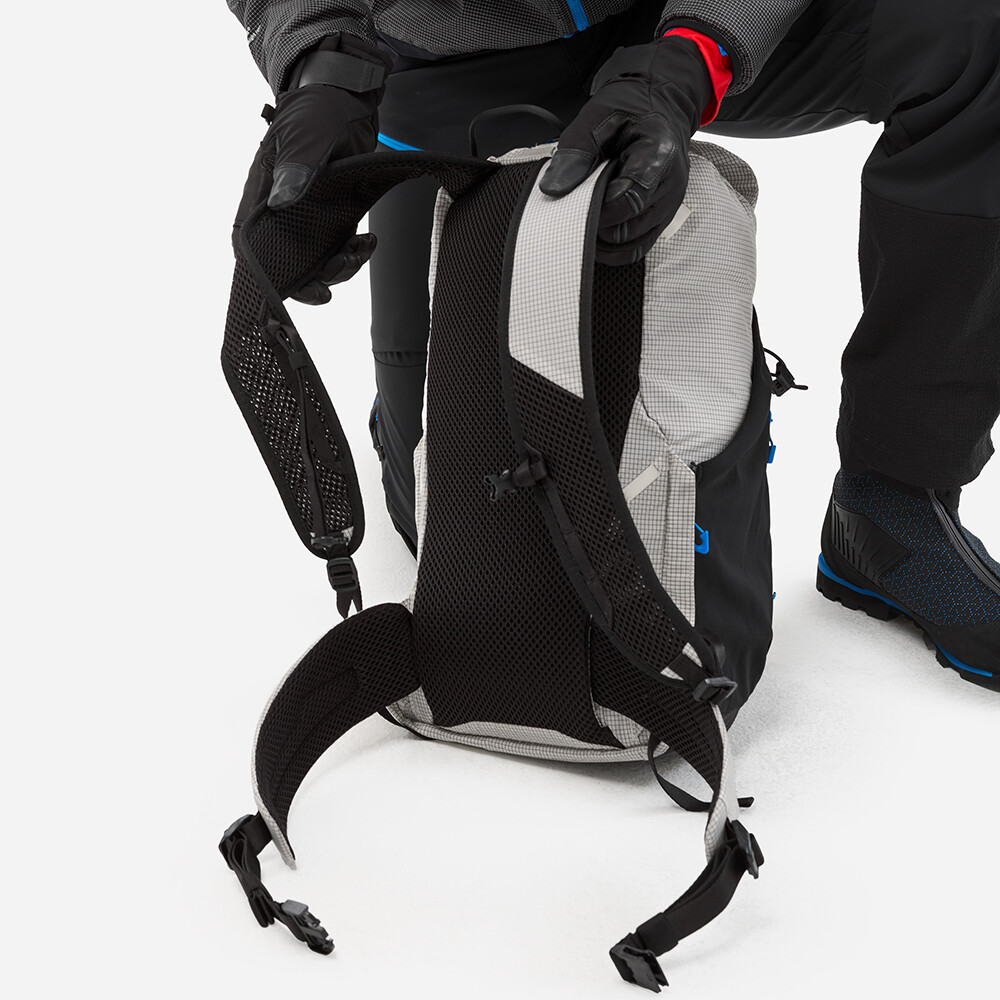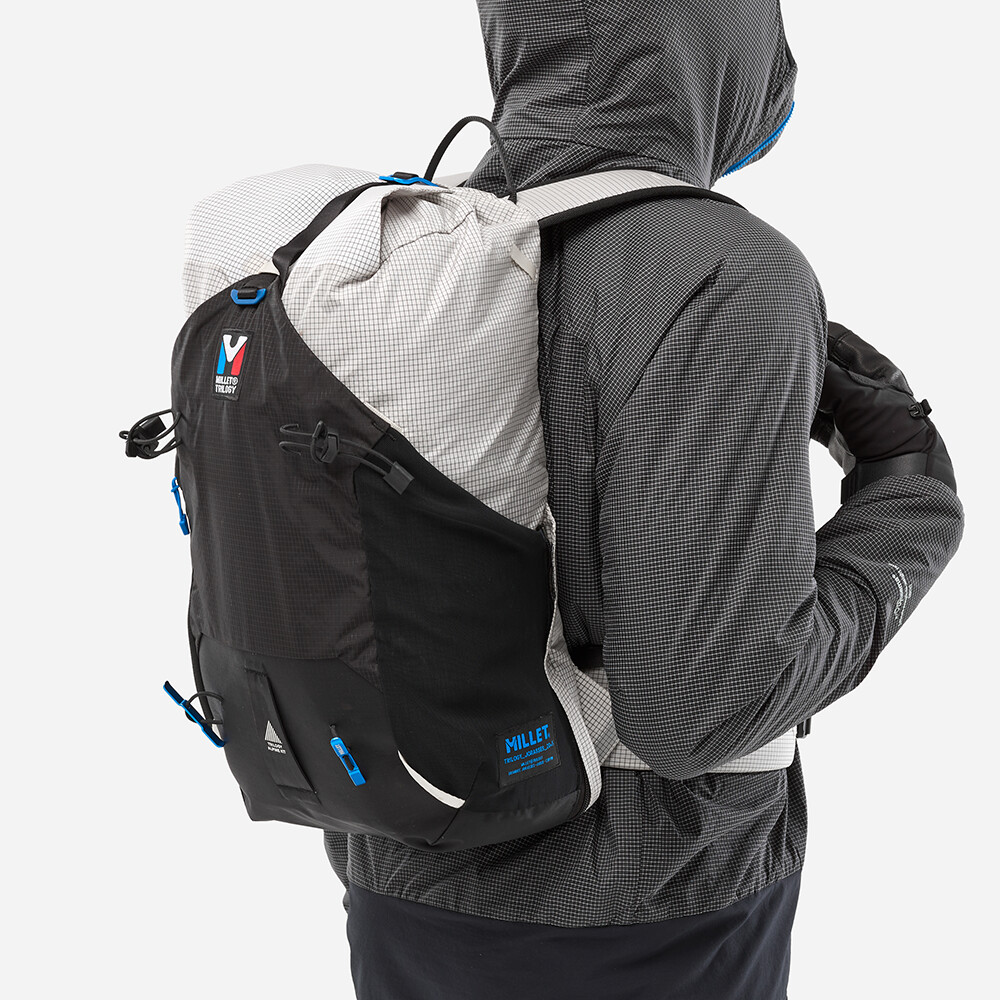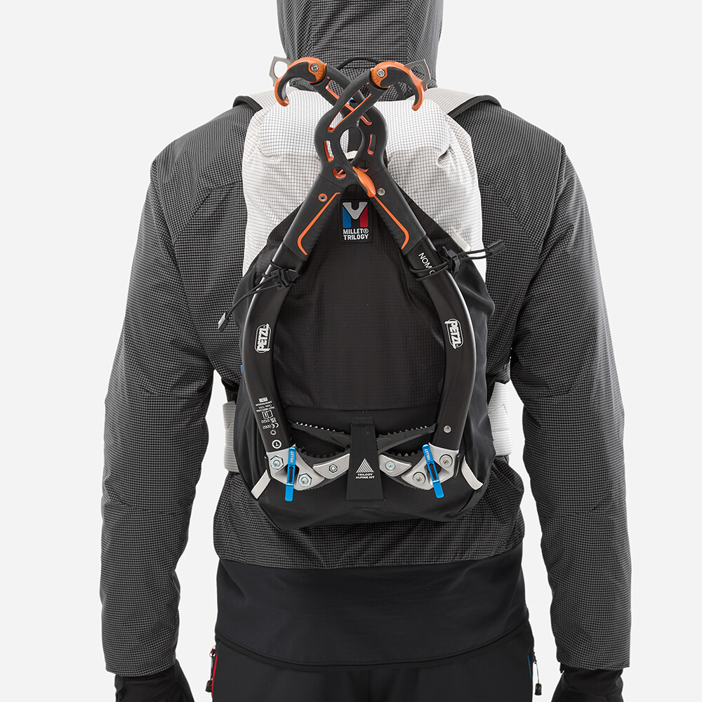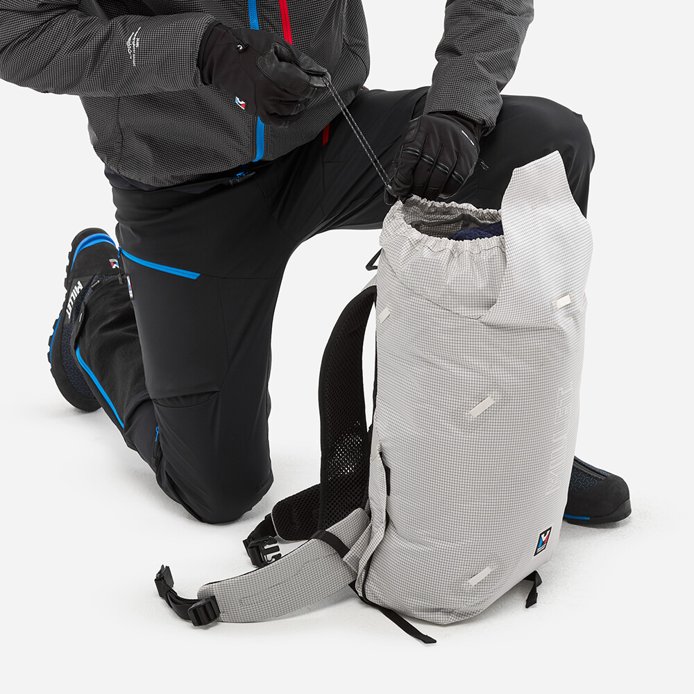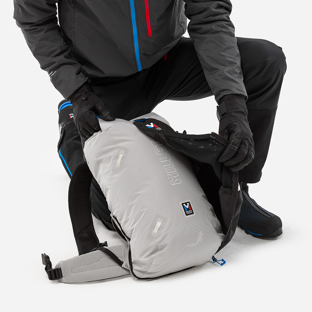Vysoko odolný batoh pre horolezcov a horolezkyne od firmy Millet. Vďaka upevňovacej časti si ho môžete ľahko prispôsobiť svojim potrebám v závislosti od horského dobrodružstva, ktoré sa chystáte absolvovať. Batoh je vyrobený z ultraľahkého materiálu, má jedno hlavné vrecko so sťahovacou šnúrkou a zapínaním na pracku a spevnené dno. Všetko sa perfektne ovláda aj v zimných rukaviciach. Ak si na túru potrebujete vziať aj cepín a lano, na prednú časť batohu pripevníte prídavný panel. Ten má pútka na cepín, sťahovaciu šnúrku na lano, možno k nemu pripevniť držiak na prilbu a vytvára vrecko na ďalšie vybavenie. Celkovo sa tým zväčší objem batohu až o 5 l. Batoh môžete použiť v zime na ľadovcovú turistiku, lezenie v zmiešanom teréne, ale vďaka hydrovakovej priehradke je vhodný aj na letné viacstupové lezenie, horské výstupy alebo ferraty.