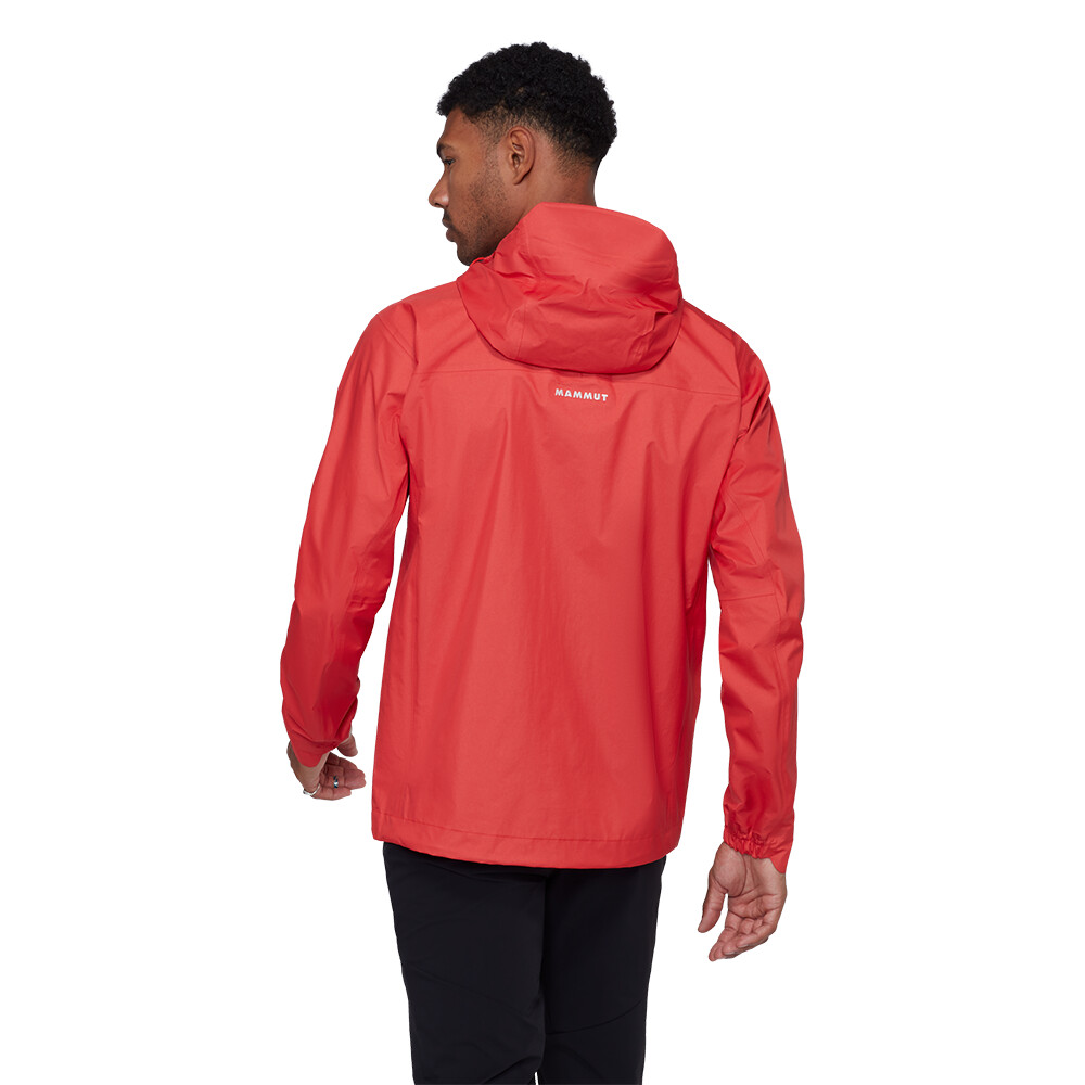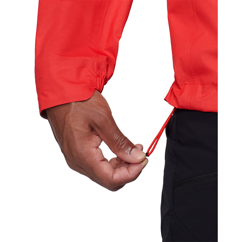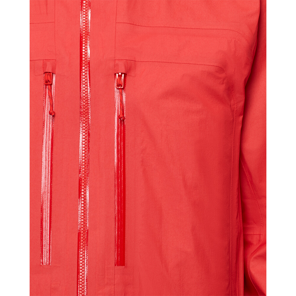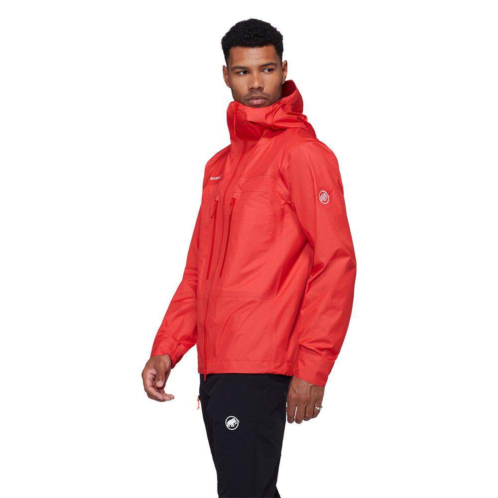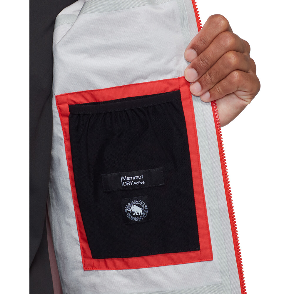 Bunda je vyrobená z ultraľahkého 3-vrstvového laminátu Mammut DRY Active. Ako už názov napovedá, ide o exkluzívnu membránu od švajčiarskeho výrobcu Mammut, ktorá je zameraná na aktívny pohyb a maximalizuje jeho priedušnosť. Nemusíte sa obávať, že by tejto bunde nejako výrazne chýbalo odvetrávanie v podpazuší. Ľahký strečový materiál je doplnený technickým strihom High Reach Technology™, ktorý je charakteristickým znakom dlhoročných skúseností firmy Mammut v oblasti horolezectva. Ergonomická kapucňa dobre sedí a neobmedzuje zorné pole. Je plne symetrická a nastaviteľná jedným potiahnutím a môžete si pod ňu bez problémov dať prilbu. Konce rukávov sú predtvarované a čiastočne elastické. Spodný lem je nastaviteľný pomocou šnúrky. Dve náprsné vrecká sú ideálne na uloženie lyžiarskych pásov alebo rukavíc. Na zbalenie bundy slúži aj vnútorné sieťované vrecko.