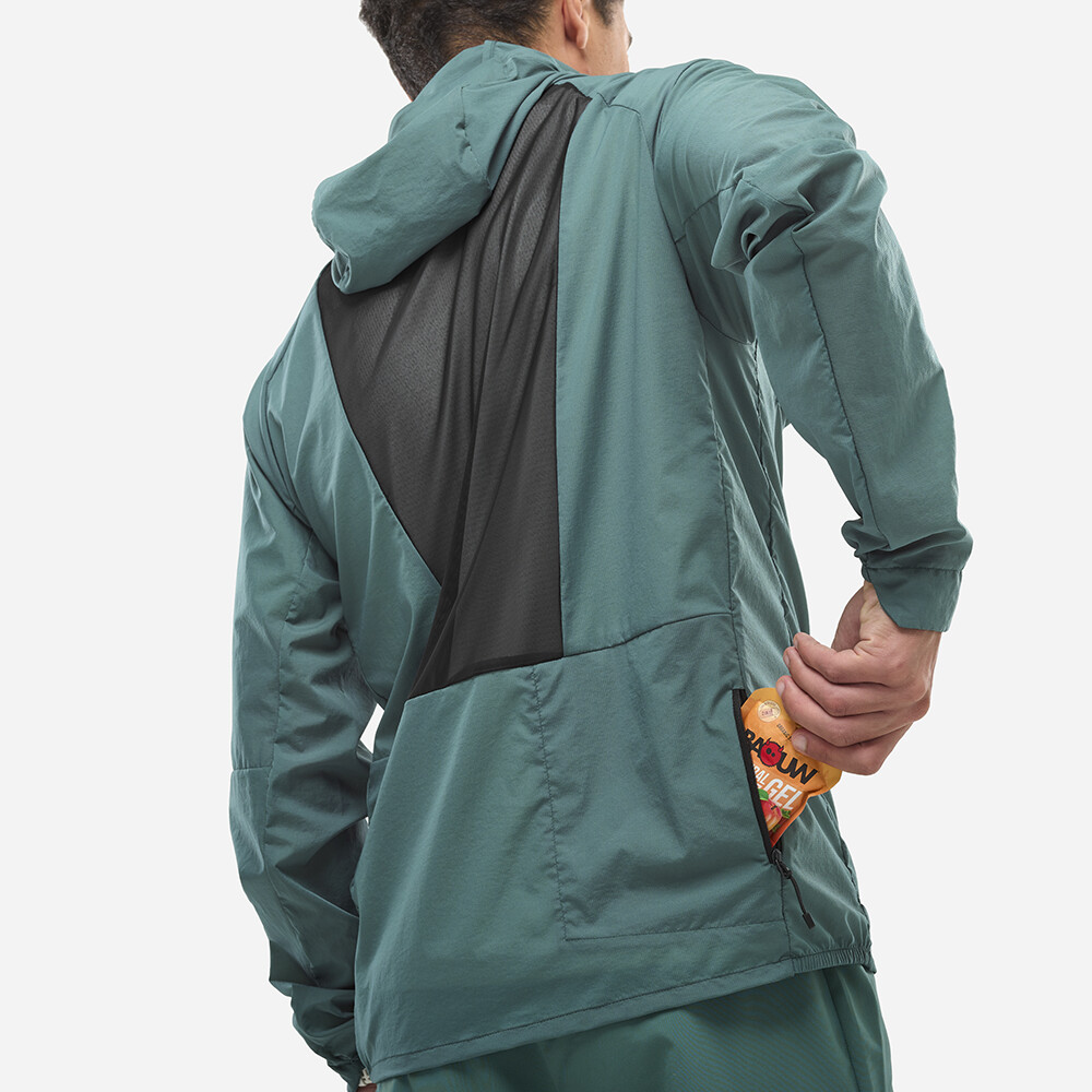 Priedušná sieťovina na chrbte zaisťuje optimálne vetranie a pohodlie aj počas intenzívneho behu. Recyklovaný polyamidový materiál je odolný, vodoodpudivý a veľmi pružný, takže neobmedzuje v pohybe. Minimalistická konštrukcia s raglánovými rukávmi podporuje prirodzený krok, zatiaľ čo elastické zakončenie kapucne, rukávov a spodného okraja zabraňuje prenikaniu chladu. Bunda je ľahko zbaliteľná do vlastného zadného vrecka, takže ju budete mať vždy po ruke, keď sa náhle zmení počasie.