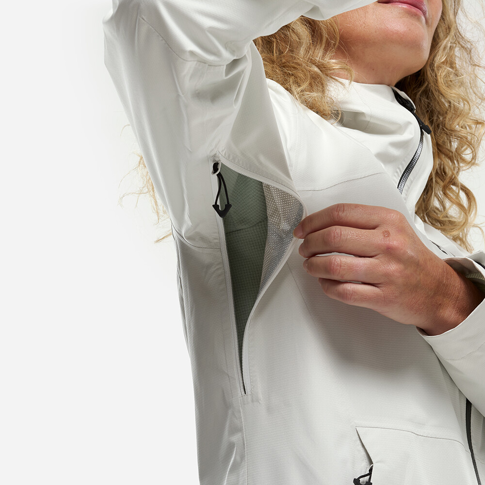 Bunda je vyrobená z recyklovaného polyesteru s ripstopovou úpravou a membránou 10K/10K DRYEDGE™, ktorá poskytuje odolnosť proti zrážkam aj dobrý odvod vlhkosti. Vďaka 2,5-vrstvovej konštrukcii bunda ponúka voľnosť pohybu a nízku hmotnosť. Vetracie zipsy v podpazuší umožňujú reguláciu teploty pri vyššej záťaži, zatiaľ čo nastaviteľná pevná kapucňa, ochranný golier a sťahovací lem zvyšujú ochranu pred nepriazňou počasia. Dve vrecká na ruky so zipsom udržia základné veci bezpečne po ruke počas každej túry.