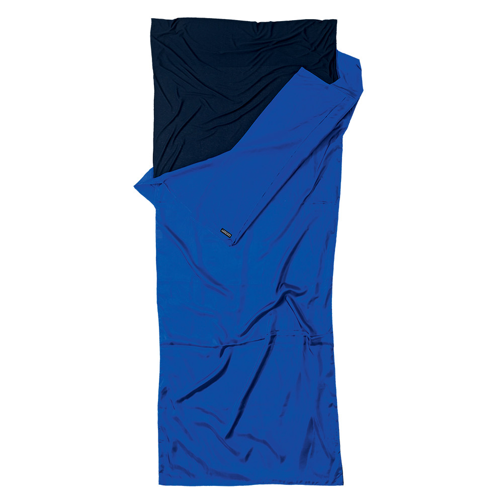 Modrá vysoce technická lehká spacáková přikrývka typu deka z kombinace Thermolite a hedvábí s kapsou na polštář, která může být použita jako samostatný cestovní spací pytel nebo hygienická vložka do spacáku.