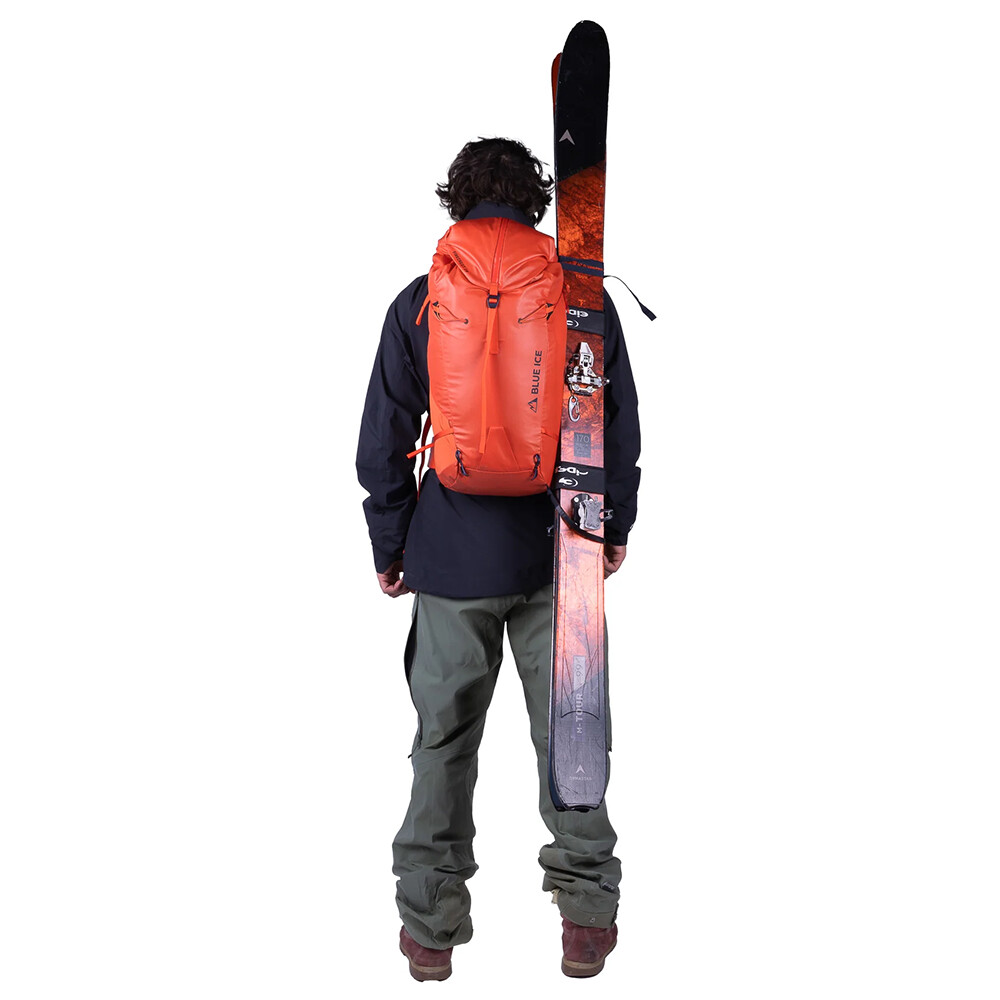 Ľahký batoh značky Blue Ice vhodný najmä na skialpinizmus a horolezectvo. Dvojaká možnosť uchytenia lyží, odnímateľné puzdro na lavínovú bezpečnosť. Vyrába sa v 2 dĺžkach chrbta. Polstrovaný bedrový pás je možné schovať.