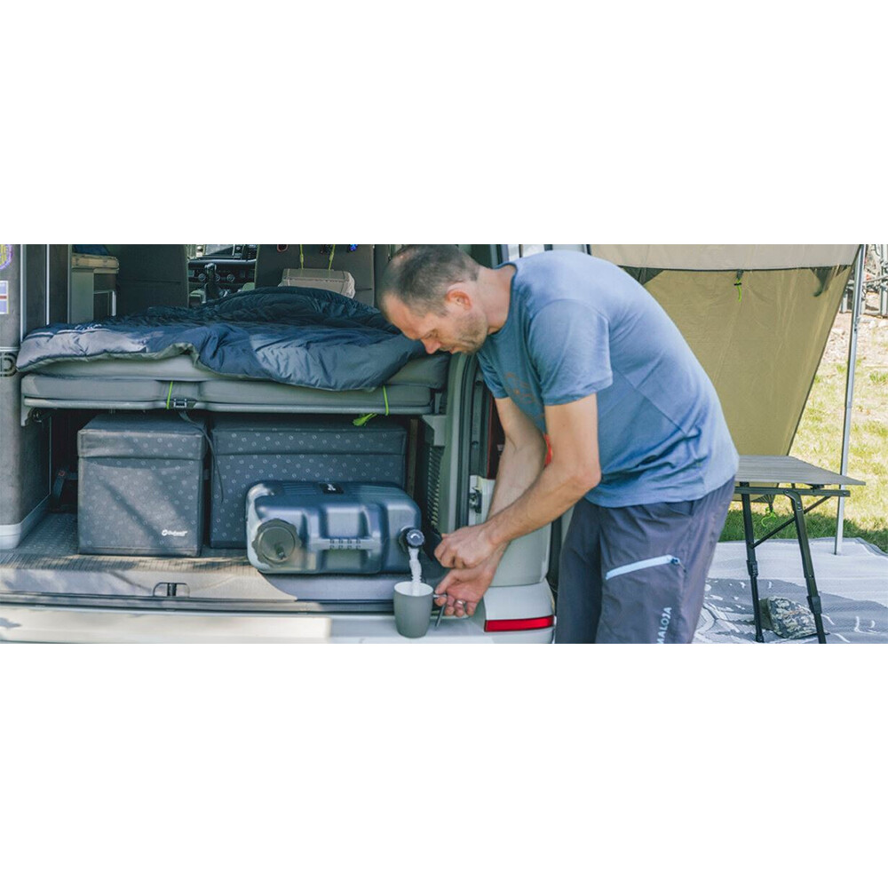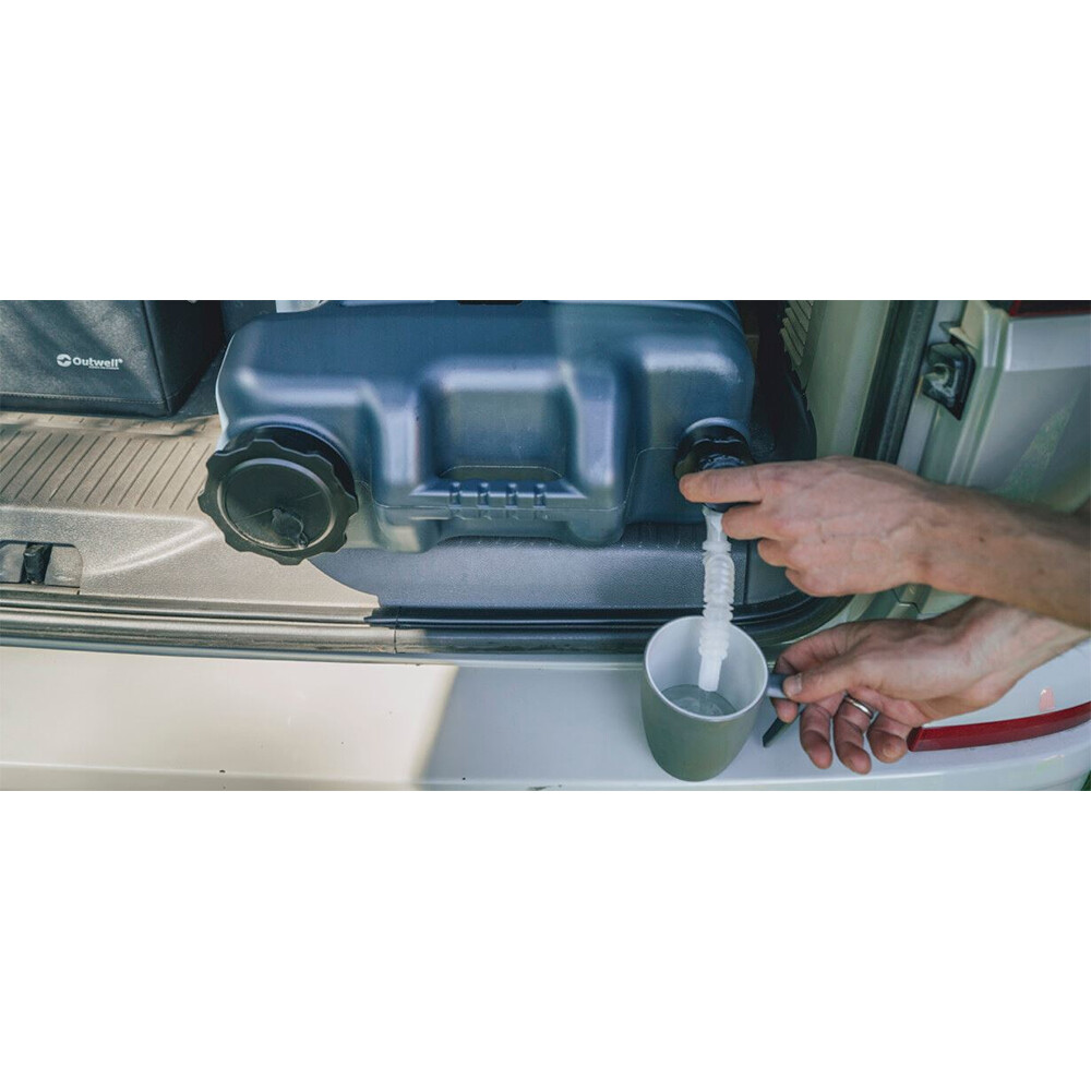Nádoba na vodu značky Outwell je z pevného materiálu a ponúka viac možností použitia. Kanister má dva otvory rôznej veľkosti, opatrené skrutkovacím uzáverom. Obidva môžete využiť na plnenie aj nalievanie. Pre jednoduchšie použitie je súčasťou aj nalievacia hadička, s ktorou si pohodlne nalejete vodu do hrnčeka alebo fľaše s úzkym hrdlom. Kanister je možné používať v horizontálnej aj vertikálnej polohe. Má tiež dve držadlá (na hornej a bočnej strane), aby sa ľahko prenášal aj pri úplnom naplnení. Je ideálnym doplnkom pri cestovaní autom alebo pri kempovaní väčšej skupiny osôb.