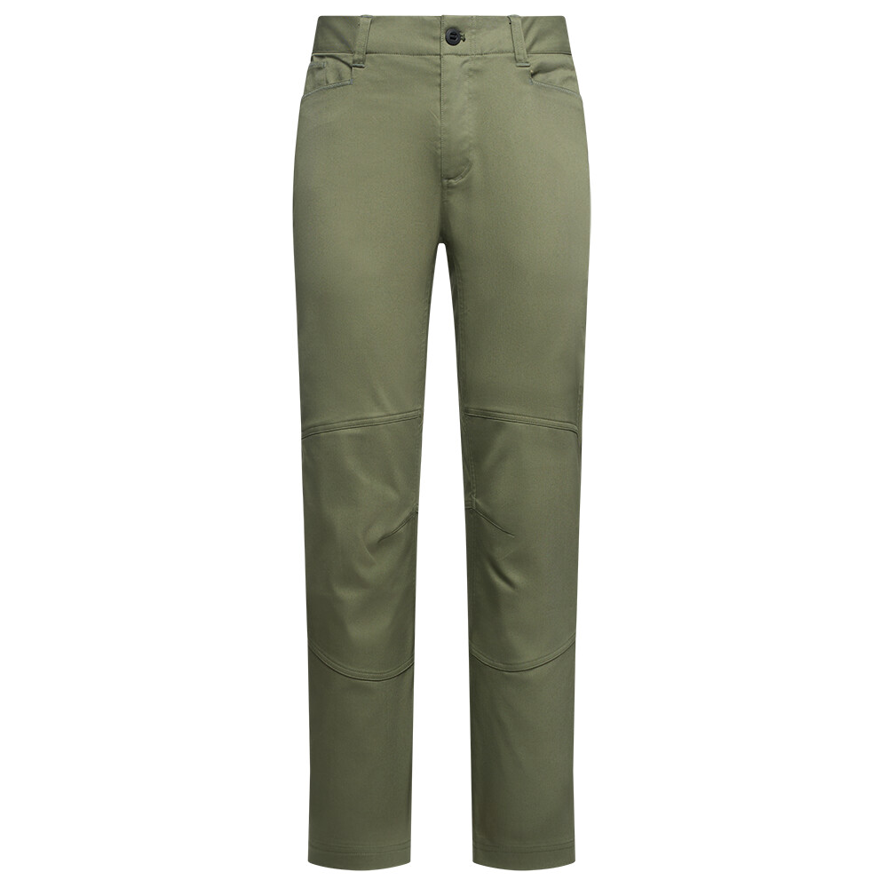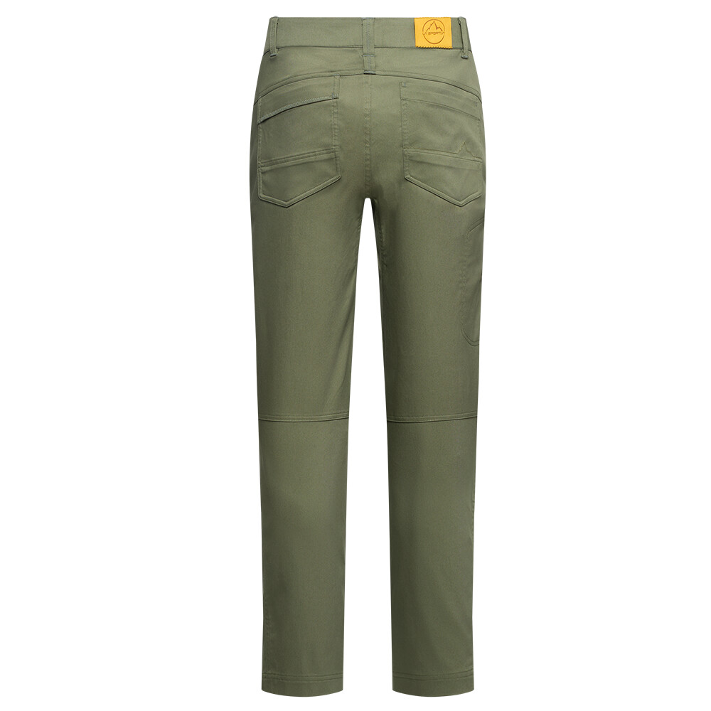 Tieto nohavice sú vyrobené z robustného materiálu zo zmesi organickej bavlny, ktorý vydrží drsnejšie zaobchádzanie aj kontakt so skalou. Pritom prímes elastanu a technicky tvarovaný strih zabezpečujú voľnosť pohybu. Predtvarované a zosilnené kolená zvládnu kľačanie, brúsenie a opakované pokusy na bouldry. Ploché, nízkoprofilové pútko na opasok je pohodlné aj pod sedákom a nikde netlačí. Nohavice ponúkajú dostatok vreciek: okrem klasických predných a zadných vreciek je k dispozícii aj vrecko na zips na stehne. Decentné horské prešívanie na zadnej strane dodáva nohaviciam nenápadný outdoorový charakter.