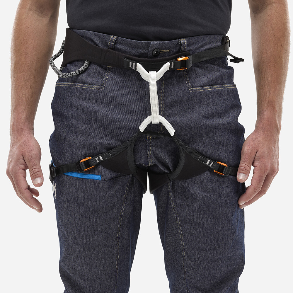 Pružný džínsový materiál v kombinácii s tvarovanými kolenami a klinom v rozkroku zabezpečujú maximálnu pohyblivosť na stene aj počas dynamických krokov. Mrštný strih ponúka dostatok priestoru v oblasti stehien a bokov, zatiaľ čo zúžené nohavice neobmedzujú prácu nôh. Plochý pás s nastaviteľnou šnúrkou je plne kompatibilný so sedacími úbormi a umožňuje pohodlné nosenie počas celého dňa.