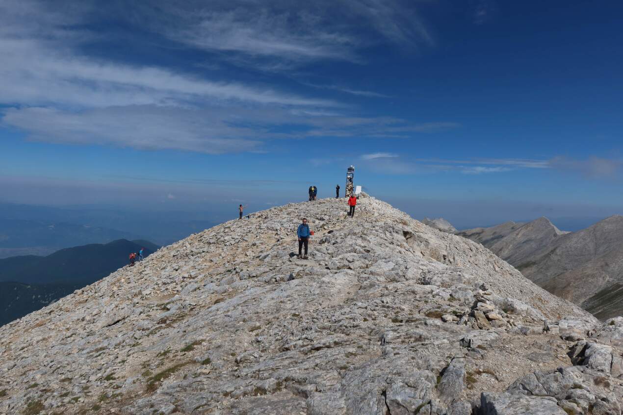 Na jeho svahoch nájdeme aj Snezhniku, najjužnejší ľadovec v Európe. Je to teda zaujímavá a atraktívna hora, ktorá je naviac dostupná aj na jednodňový výlet. To prináša, samozrejme, čoraz viac turistov. Našťastie sme tu relatívne skoro. No na samotnom vrchole sa to návštevníkmi aj tak len hemží. Takže sa len rýchlo rozhliadneme a zahryzneme sa do zostupu.