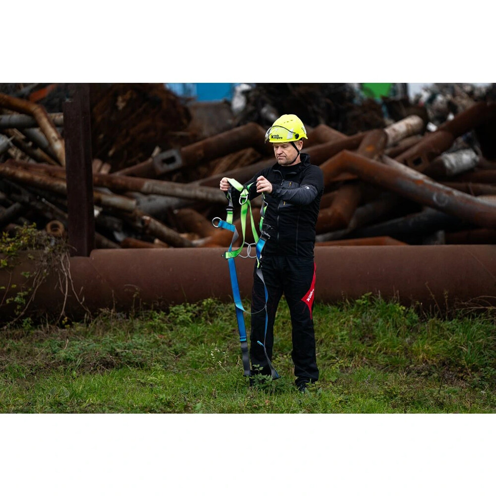 Všestranný pracovný postroj v špeciálnej čiernej edícií. Pevnostný pružný popruh v zadnej časti sedáku, zaisťuje optimálnu polohu nohavíc voči pasu pri všetkých možných polohách pracovníka.