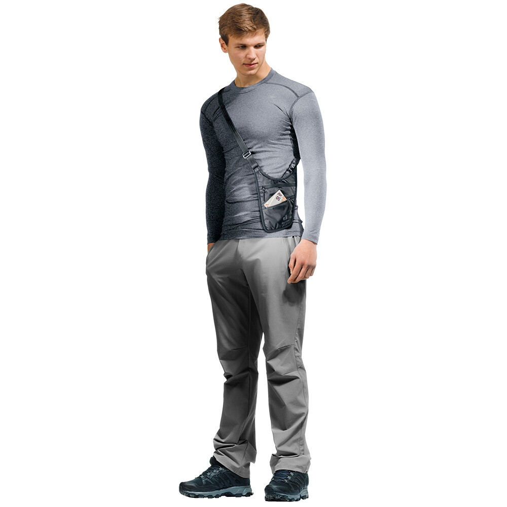 Bezpečnostné puzdro od spoločnosti deuter je ideálna cestovná peňaženka. Má plochý profil, je vyrobená z ľahkého materiálu a dokonale sa schová pod tričko alebo košeľu. Vaše doklady, peniaze, kreditné karty, letenky a iné cennosti sú v bezpečí na tele a na dosah ruky. Má dve vrecká na zips a vnútornú sieťovanú priehradku. Možno ju nosiť cez telo (crossbody) alebo ako klasickú ľadvinku. Popruh má nastaviteľnú dĺžku a k dispozícii je aj odnímateľný bedrový pás. Materiál je príjemný aj pri nosení na holú kožu.