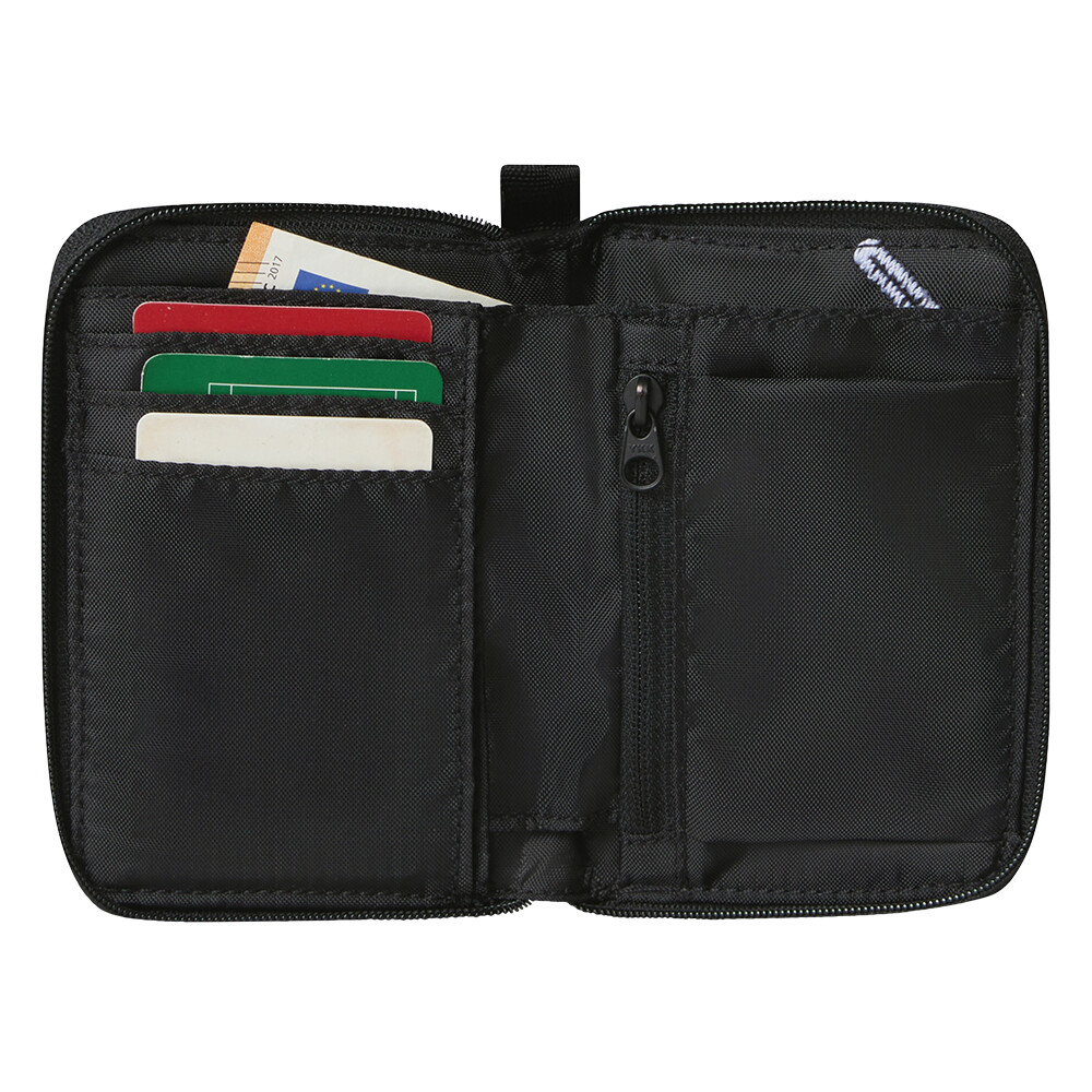 Cestovná peňaženka na doklady, peniaze, kreditné karty a iné cennosti. Má dve vrecká na zips, plochý profil, je vyrobená z ľahkého materiálu a dokonale sa schová pod oblečením. Je navrhnutá tak, aby sa dala nosiť okolo krku.