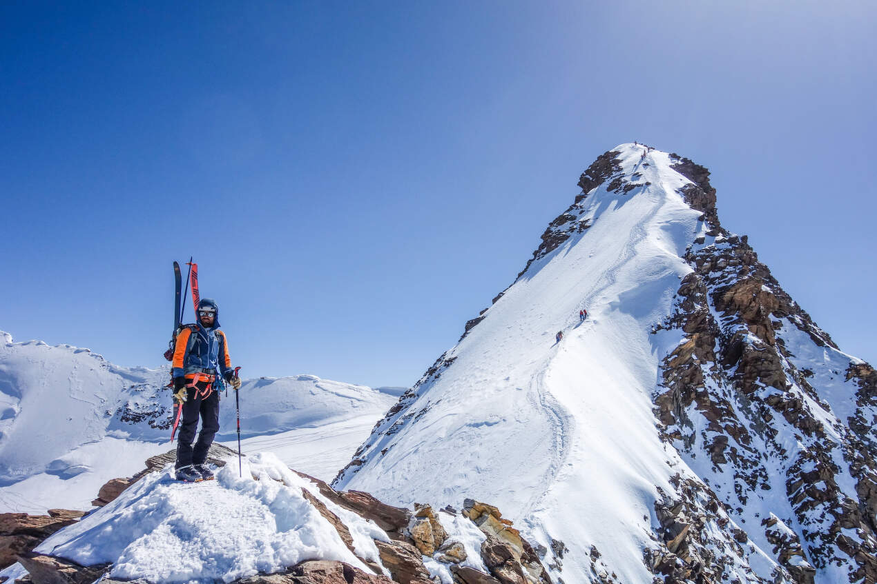 Týmto variantom ale nikto nechodí a je o ňom len minimum informácií. Vsádzame však na túto divokú kartu a cesta sa ukazuje ako priechodná, v najstrmejšom mieste so sklonom 50°. Čoskoro sa napájame na normálku, kde je kopec ľudí. Naviazaní na lane doliezame okolo desiatej hodiny na druhý najvyšší bod Álp, ktorým je Dufourspitze (4634 m). Pokoj, teplo, bezvetrie. Vďaka nášmu komplikovanejšiemu prístupu k normálke sme na konci hlavnej vlny skialpinistov z tradičného východiskového bodu. A práve preto si môžeme nakoniec vrchol užívať iba sami pre seba.