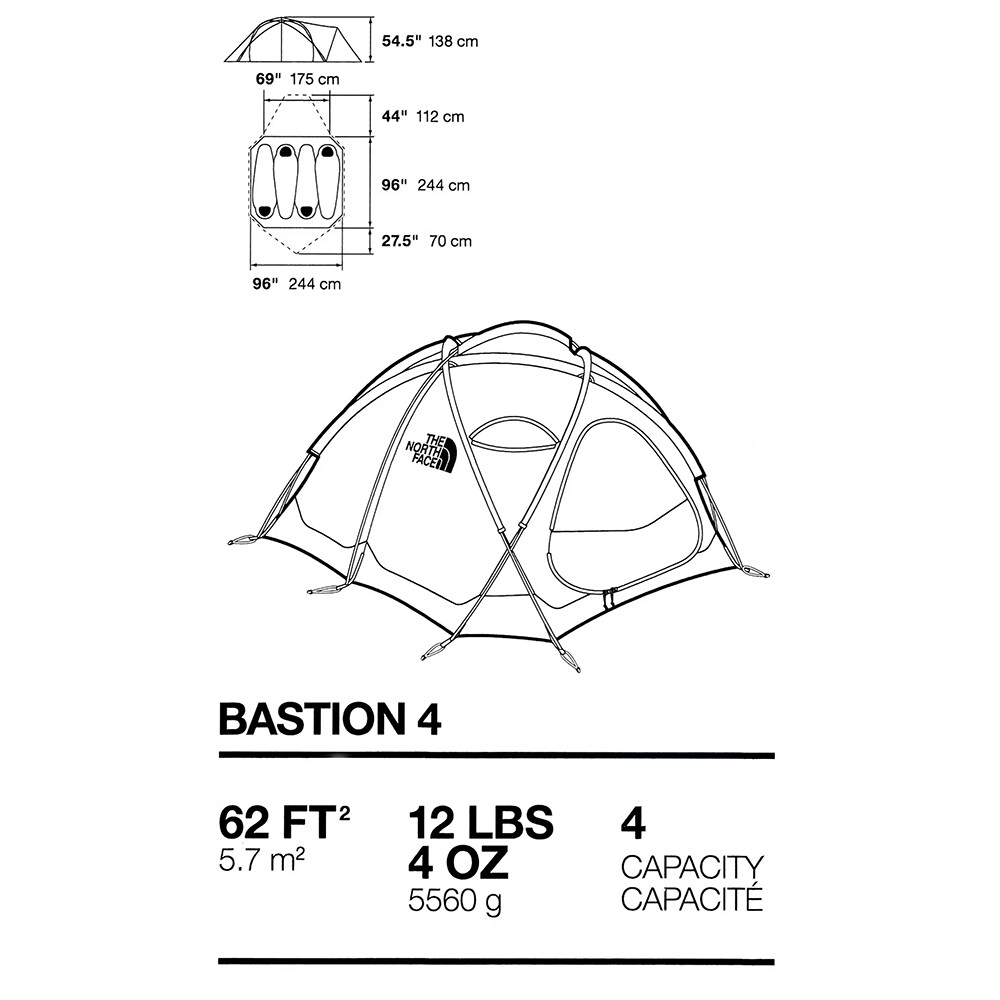Celoročný stan The North Face Bastion 4 zo série The North Face Summit Series™ je ideálny stan na vysokohorskú turistiku a extrémne expedície. Je vyrobený z odolného nylonu a strieška je z ripstopovej tkaniny s tropikom a podšívkou s vodoodpudivou úpravou. DAC tyče a kolíky sú na svoju hmotnosť veľmi pevné a samotná konštrukcia pomáha zvládnuť aj silný vietor. Značka North Face nezabudla ani na pútka na zavesenie neoprénov, dvojité vstupy a farebne odlíšené pútka na zips, ktoré v tme svietia, takže aj po dlhom dni na stene nájdete cestu domov.