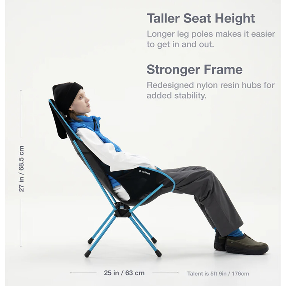 Prepracovaná klasika od spoločnosti Helinox, to je skladacia stolička Sunset Chair. Vďaka vysokému operadlu a celkovo vyššej konštrukcii sa na nej pohodlne sedí a zároveň poskytuje plnú oporu pre váš krk, hlavu a chrbát. Má vylepšenú konštrukciu sedadla, pričom po obvode pribudla druhá napínacia šnúra na ešte lepšie rozloženie hmotnosti. Príjemným doplnkom je bočné vrecko, do ktorého si môžete uložiť veci, ako je mobilný telefón alebo čelovka, a operadlo, ktoré môžete vypchať vecami, ako je bunda. Stolička Sunset je ideálna na kempovanie alebo piknik v parku.