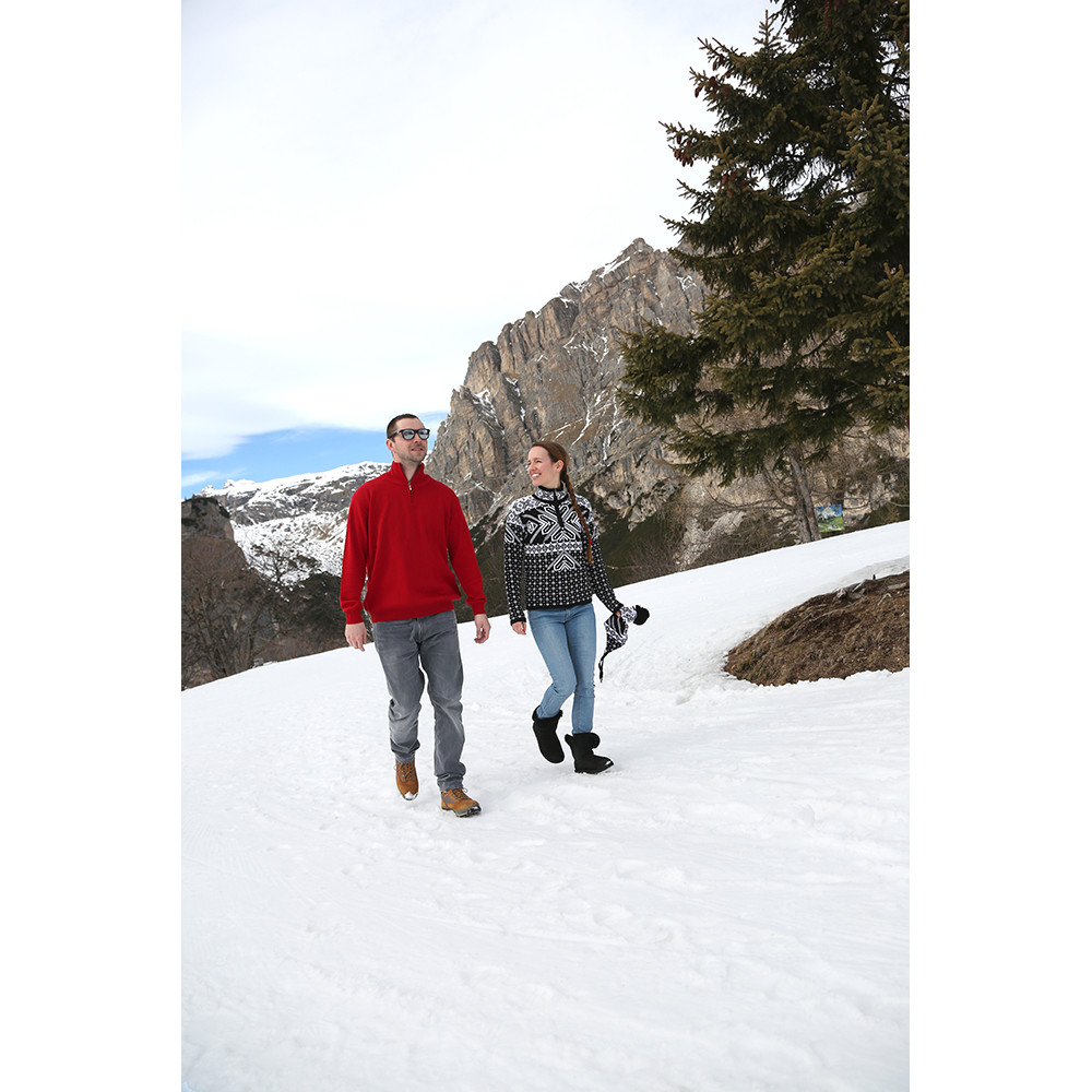 Setter z merino vlny, ktorý kombinuje tradičný nórsky vzor s moderným strihom a praktickým stojačikom na zips. Vhodná na výlety, ale aj na každodenné nosenie.