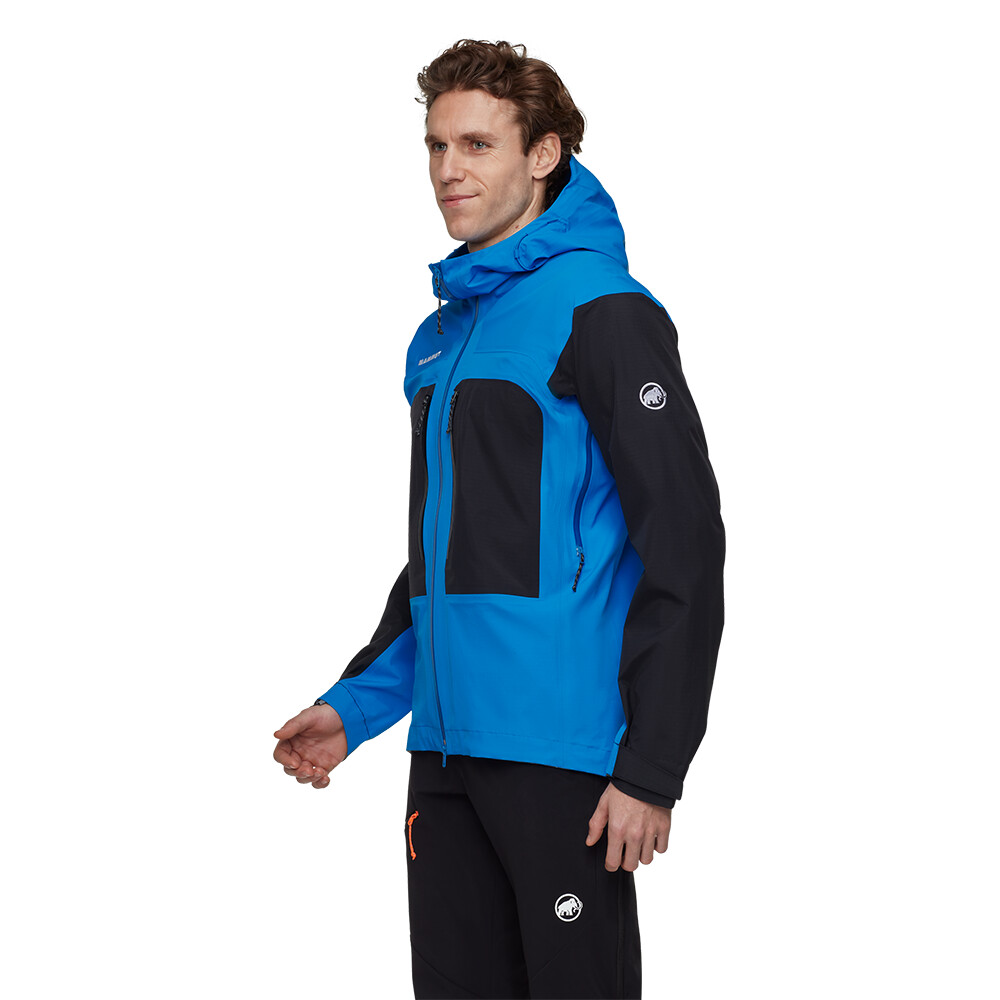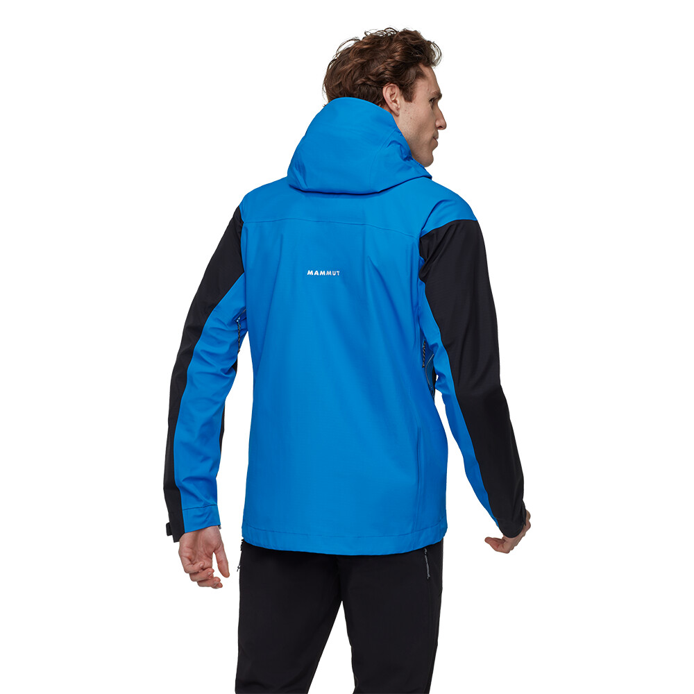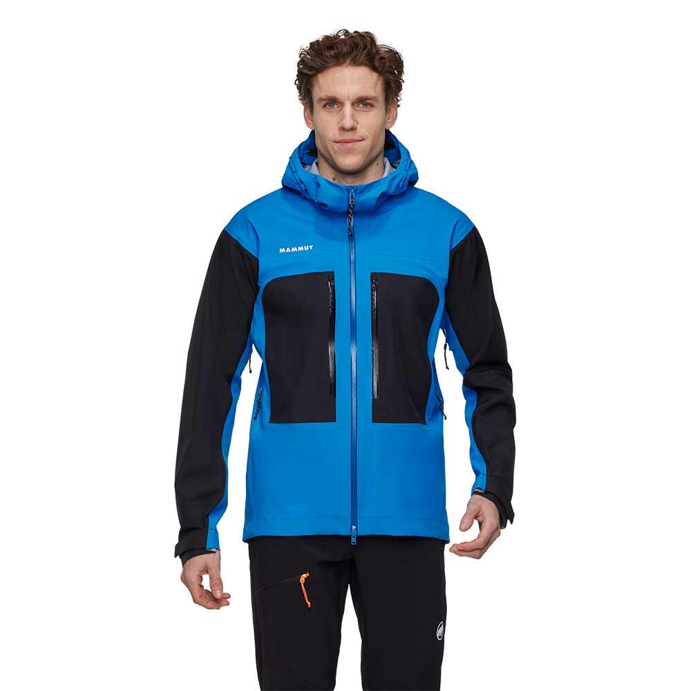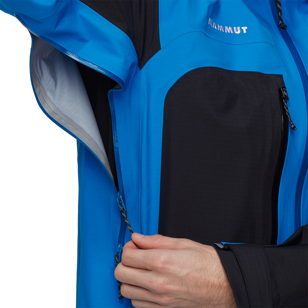 Bunda je vyrobená z materiálu Mammut DRY Expedition, ktorý je extrémne priedušný, nepremokavý a vetruodolný. Tkanina Ripstop zaručuje výnimočnú odolnosť. Športový strih vám poskytne voľnosť pohybu. Nastaviteľná kapucňa je kompatibilná s prilbou. Dve vrecká na zips sú skvele prístupné, aj keď máte na sebe lezecký sedák alebo zapnutý bedrový pás batohu. Drobnosti si môžete uschovať vo vnútornom vrecku na zips. Vetranie na zips v podpazuší umožňuje reguláciu teploty. Rukávy majú nastaviteľné manžety, ktoré môžete obsluhovať aj v rukaviciach. Nastaviteľný je aj spodný lem.