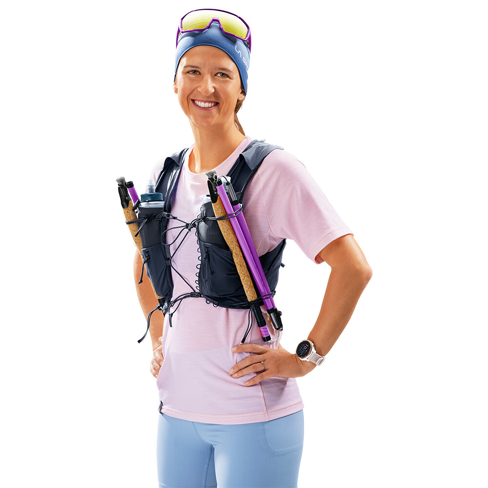 Dámsky batoh (vesta) pre trailových bežcov. Umožní vám vziať si so sebou všetko, čo potrebujete. Má dve vrecká na mäkké stlačiteľné fľaše, vrecká na gély, bundu, mobilný telefón, palice. Kompatibilný s hydrovakmi do objemu 2 l.