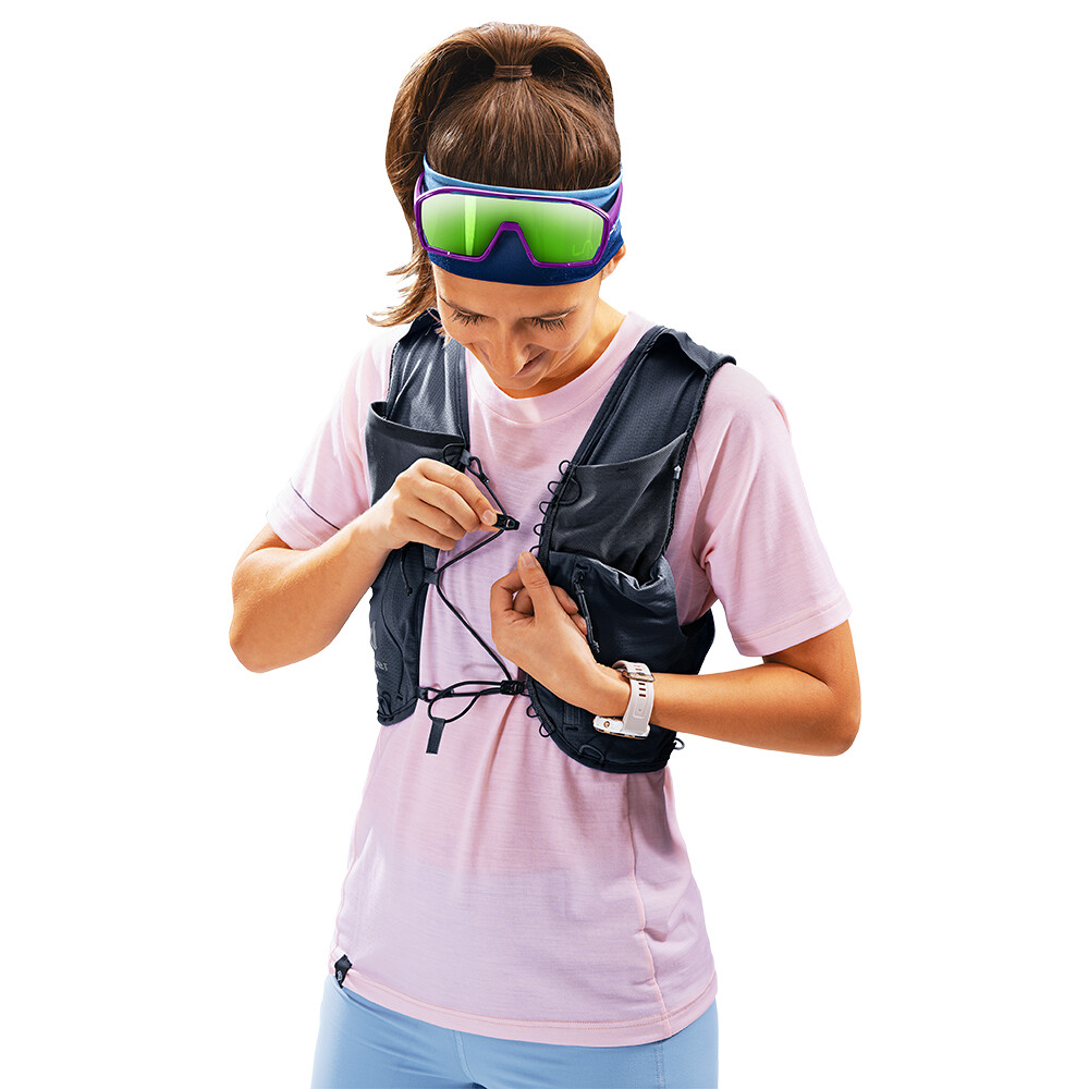 Bežecký batoh alebo vesta Traick 9 SL od spoločnosti deuter vám pomôže preniesť všetko, čo potrebujete na zvládnutie vybraného trailu. Má dve predné vrecká na mäkké stláčacie fľaše, otvorené vrecká a vrecká na zips na ramenných popruhoch na uloženie energetických gélov a tyčiniek. Zaujímavým prvkom je samostatné vrecko na hydratačný balíček a vrecko na zips na bundu, ktoré môžete vybrať bez toho, aby ste museli batoh zložiť z chrbta. K batohu je možné pripojiť aj bežecké alebo turistické palice. V prednej časti má vesta nastaviteľný elastický hrudný pás, ktorý vám umožní dokonalé prispôsobenie pri strmých stúpaniach a rýchlych behoch. Model SL je veľkostne prispôsobený drobnej ženskej postave.