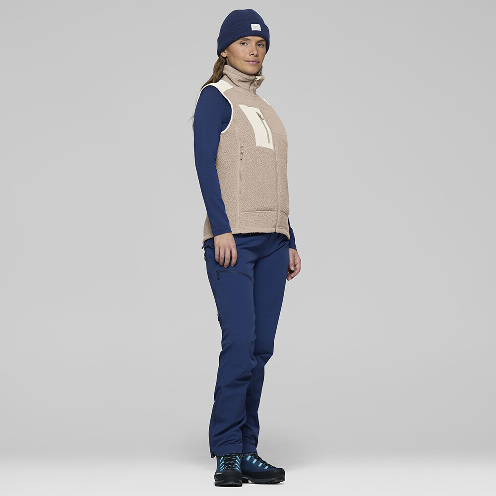 Dámska vesta Norrona trollveggen warm3 Vest využíva pokročilú pleteninu Pile fleece, ktorá je nielen ľahká, ale predovšetkým vysoko izolačná a odolná. Aj po dlhodobom intenzívnom používaní si vesta zachováva svoj pôvodný vzhľad a pružnosť, čo z nej robí spoľahlivého partnera na mnoho sezón. Je skvelá ako izolačná vrstva pod hardshellovú bundu, ale vďaka odolnosti proti vetru môže slúžiť aj ako vonkajšia vrstva počas aktívneho pohybu v miernejších podmienkach. Praktické prvky, ako sú dve vrecká na ruky, náprsné vrecko a ochranný vysoký golier, zvyšujú pohodlie v chladných podmienkach, zatiaľ čo pravidelný strih umožňuje jednoduché vrstvenie. Pod túto fleecovú vestu si oblečte merino tričko. Svoje využitie nájde najmä pri aktivitách, ako je treking a turistika, horolezectvo alebo skialpinizmus a lyžovanie.
